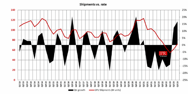 据GPU方面最新的统计报告显示,GPU出货量在2023年第三季度迎来了新的增长,增幅达到16.8%,出货量也增至7190万颗。