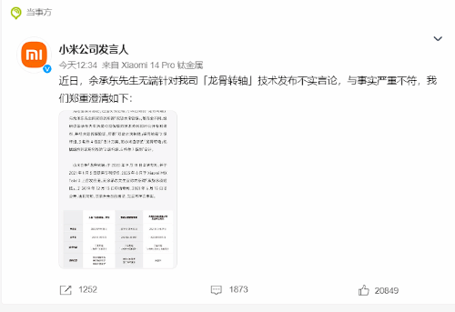 12月12日,微博@小米公司发言人发文称,近日,余承东先生无端针对我司龙骨转轴技术发布不实言论,与事实严重不符。我们请余承东先生遵循“科学与严谨”的基本规则,请勿再抹黑同行、误导公众。