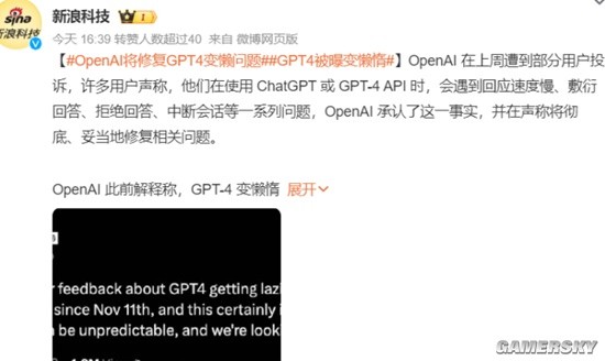 据新浪科技报道,OpenAI在上周遭到部分用户投诉,许多用户声称,他们在使用 ChatGPT 或 GPT-4 API 时,会遇到回应速度慢、敷衍回答、拒绝回答、中断会话等一系列问题,OpenAI 承认了这一事实,并在声称将彻底、妥当地修复相关问题。