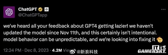 OpenAI 此前解释称,GPT-4 变懒惰的原因是,OpenAI 从 11 月 11 日起就未再更新模型,而 GPT 模型也正因此变得不可预测,当前该公司正在着手修复问题。据悉,用户抱怨 GPT-4 模型变“懒惰”是指,用户请求 GPT-4 撰写表格,但该模型仅仅输出三行;输入一段代码,模型只输出一些信息,随后再指示用户填写剩下的其他部分。有时候,GPT-4 甚至会告诉人们“你们完全可以自己完成这些工作”。