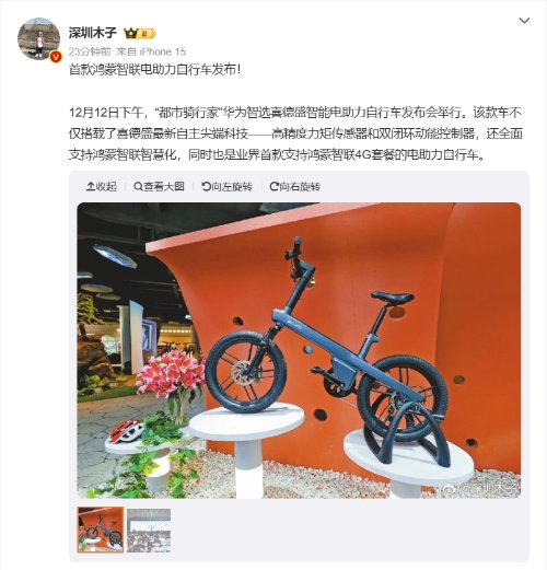 据宝安日报报道,首款鸿蒙智联电助力自行车于12月12日发布,是一款“都市骑行家”华为智选喜德盛智能电助力自行车。从造型来看,该车采用了简洁设计,配有前后碟刹,官方宣称车架采用航空材质 X6 铝合金,并使用一体式平焊工艺,车架外观无任何焊接点。