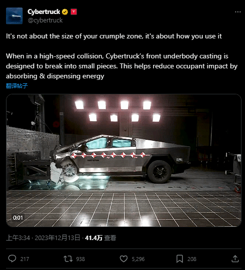 然而,特斯拉指出,Cybertruck 的前底盘铸件也在降低碰撞时对驾乘人员的冲击方面发挥着重要作用。特斯拉在 X 上写道:“溃缩区的大小并不重要,重要的是如何使用它。在高速碰撞时,Cybertruck 的前部底盘铸件会碎裂成小块,从而吸收和分散能量,降低对驾乘人员的冲击。”