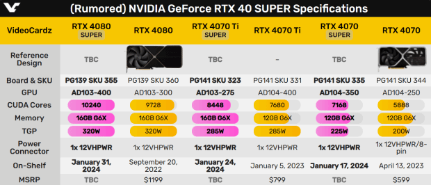 发布时间方面,RTX 4080 Super公版频率型号将于1月30日解禁,高配版将于1月31日解禁,售价为999-1099美元。