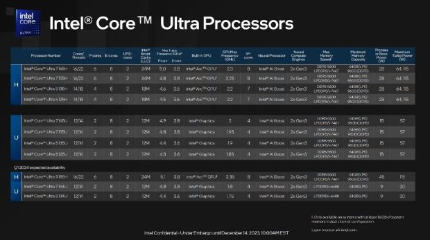 Intel酷睿Ultra家族分为H、U两大系列,第一批首发的是28W的H系列和15W的U系列,45W的H系列与9W的U系列则要等到明年第一季度才能与大家见面。