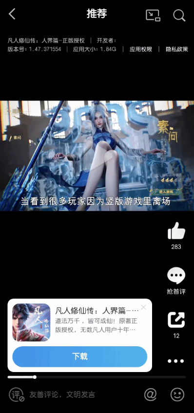 而当用手机端APP观看这条微博时,可以看到这是一款名为《凡人修仙传:人界篇》游戏的广告。