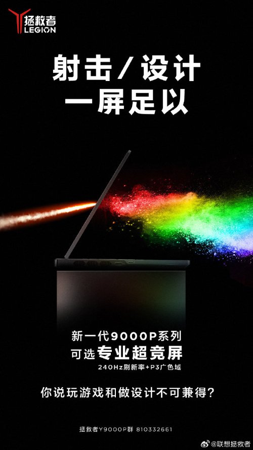 Y9000P配备相同的处理器和显卡,并提供了专业超竞屏选项,提供240Hz刷新了和P3广色域,令设计与游戏兼得。