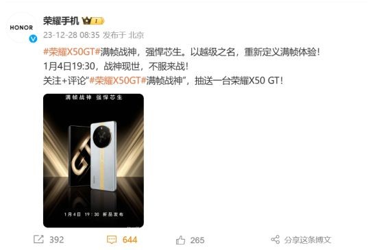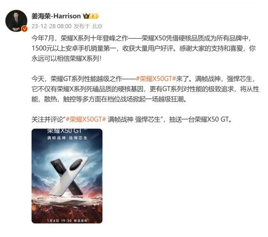 12月28日,荣耀终端有限公司中国区CMO姜海荣发文称,荣耀GT系列性能越级之作——荣耀X50 GT正式定档2024年1月4日。“满帧战神强悍芯生”的荣耀X50 GT,不仅延续了荣耀X系列死磕品质的硬核基因,更根植荣耀GT系列对性能的极致追求。作为从品质到性能的集大成者,荣耀X50 GT将从性能、触控、散热等方面多管齐下,在档位战场席卷一阵越级狂潮。