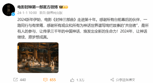 “2024新年伊始,电影《封神三部曲》走进第十年。感谢所有台前幕后的伙伴,一路同行与有荣焉,感谢所有观众和所有为神话世界谱写绚烂故事的“共创者”,是所有人的参与,让传承三千年的中国神话,焕发出全新的生命力!2024年,让神话继续,愿梦想成真。 ???”