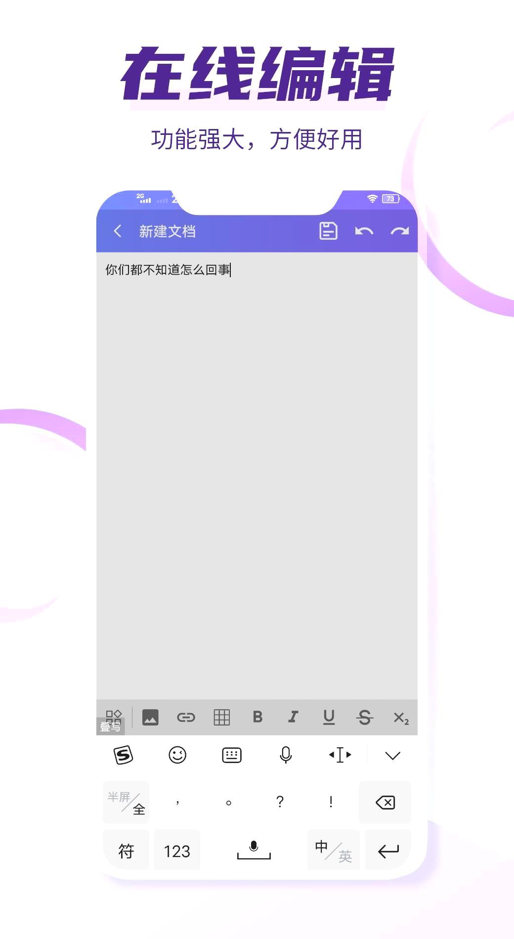 这是一款多功能文档编辑工具。它可以轻松创建、编辑和分享各种文档类型,包括文字、表格、演示文稿等。直观简洁的界面让您能够迅速掌握,无需复杂的步骤,云存储功能让您随时随地都能访问文件,确保了工作的便捷性,使工作变得更加轻松愉快。
