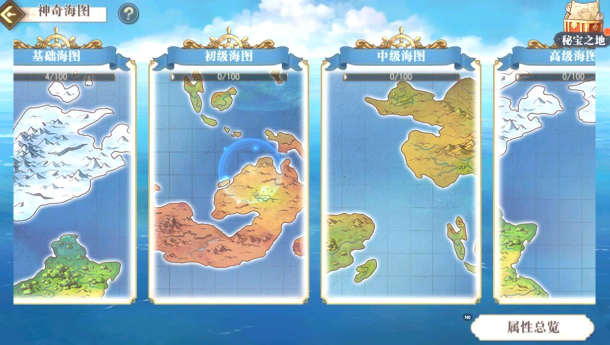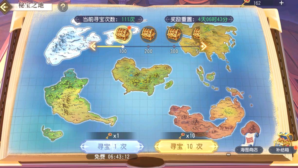 进入秘宝之地后,可以使用“宝藏钥匙”进行探险,以获取岛屿、指南针、海图线索(用于升级岛屿的材料)以及海图币。探险次数达到一定数量时,可以解锁宝箱,获得额外的奖励。(请注意重置的时间)。