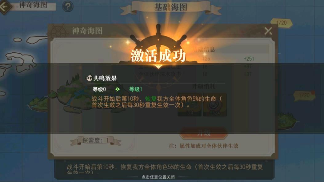 1.船长等级提升至105级时,将解锁神奇海图功能。 2.岛屿能够赋予伙伴们各种属性加成(这些加成对所有伙伴都有效)。 3.如果某张海图内的岛屿等级都达到特定标准,就会触发岛屿共鸣效果。