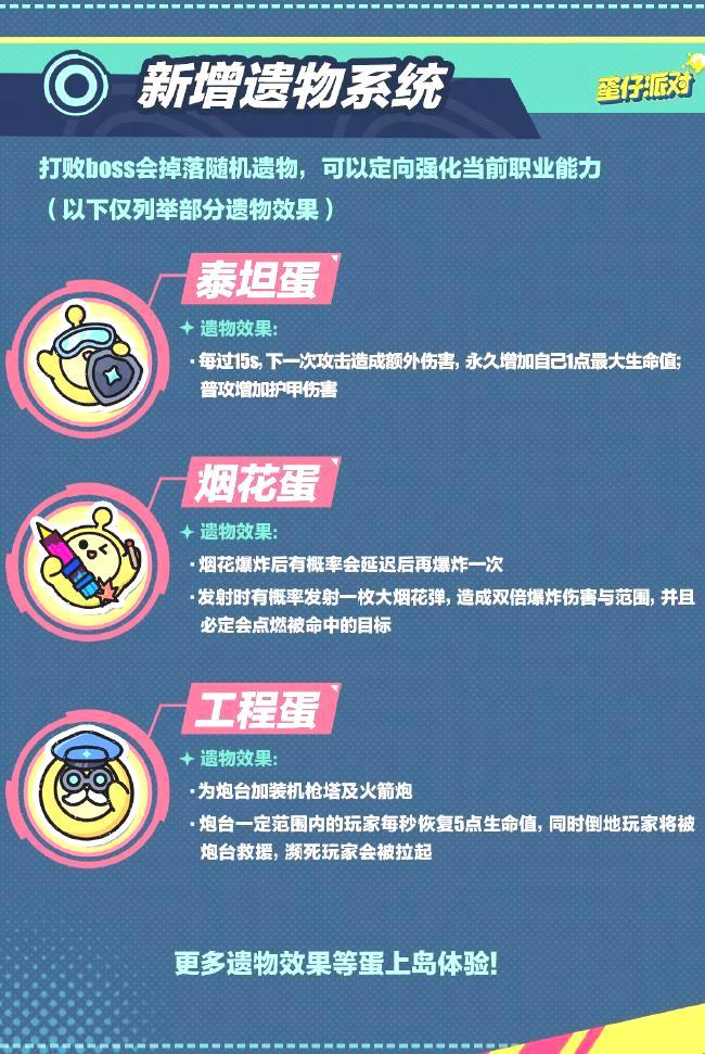 在游戏里战胜BOSS后,玩家可以获得随机遗物,这些遗物能够有针对性地增强玩家当前职业的能力。例如,泰坦蛋的遗物效果之一是:“每隔15秒,下一次攻击将造成额外伤害,并永久提升1点最大生命值”,而烟花蛋的遗物效果之一则是:“烟花爆炸后有一定几率会延迟再次爆炸”。每个职业都拥有其独特的专属遗物,想要探索更多遗物的效果,就快来蛋上岛体验吧!
