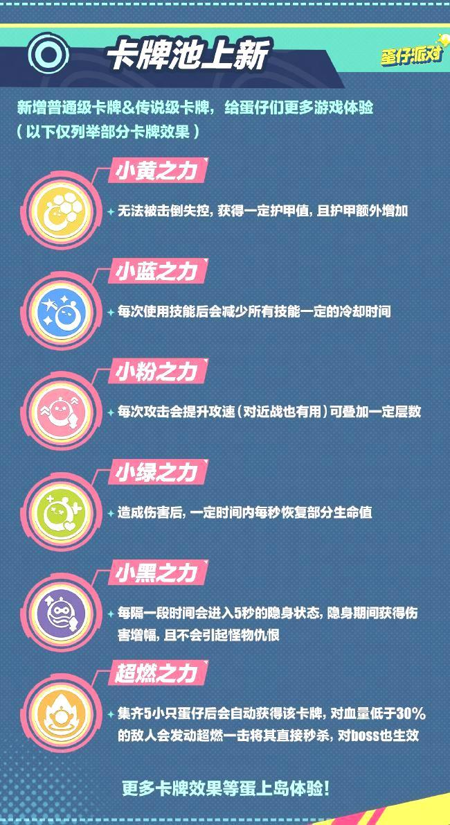卡牌库再次充实!这次更新,推出了许多引人入胜的普通和传说卡牌。战局变幻莫测,玩家们可以根据新卡牌的特性,运用策略对抗对手,构建适应当前战局的最佳牌组,实现从量变到质变的飞跃。比如新推出的小黄之力、小蓝之力、小粉之力、小绿之力、小黑之力,玩家们一旦集齐这些卡牌,就会自动获得强力卡牌“超燃之力”——对生命值低于50%的敌人发动致命一击,直接将其击败,对首领同样有效!更多卡牌效果和搭配,等你来蛋上岛探索体验!