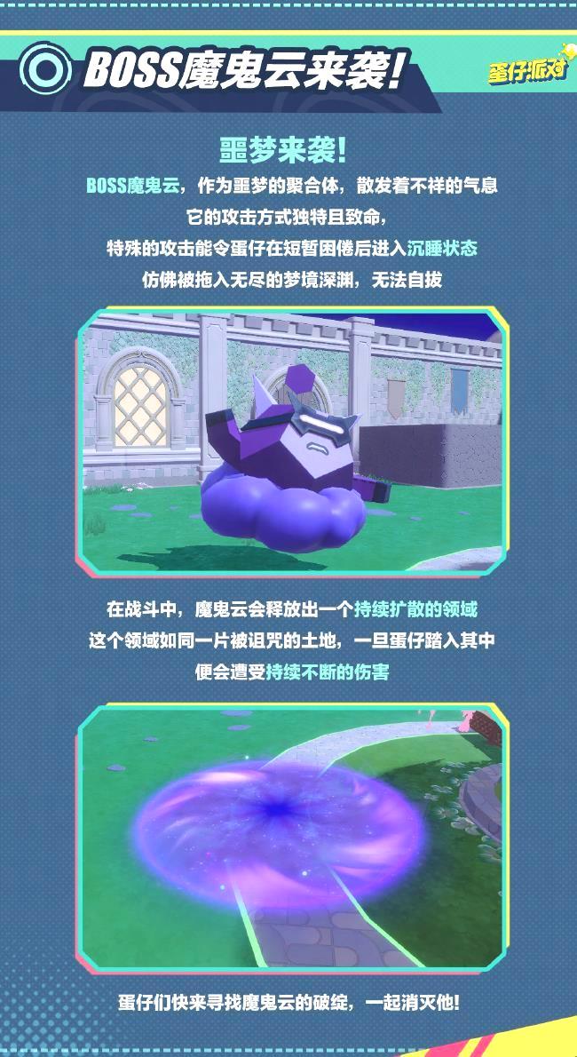 新地图给小蛋仔们带来了新的挑战——新BOSS“魔鬼云”登场了!它作为噩梦的集合体,散发着不详的气息。它的攻击方式独特且致命,特殊的攻击能让蛋仔短暂困倦后陷入沉睡,好像被拉进无尽的梦境深渊,无法挣脱。