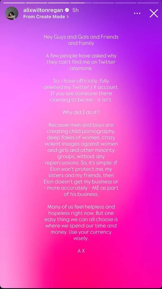 在此次声明中,Regan 表示,自己离开 X 的根本原因在于平台环境持续恶化。她直言,目前网络上存在大量针对女性的深度伪造成人内容(AI脱衣等),以及对女性、女孩和少数群体的暴力图像,而这些行为却几乎没有得到应有的惩处。