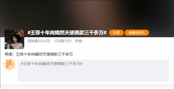 据媒体报道,2013年与李亚鹏离婚后,王菲连续十年以“匿名捐赠人”身份向嫣然天使基金会捐款,总额达3268万元。
