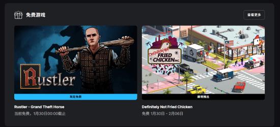 Epic游戏商城本周免费游戏已经上线,《Rustler (Grand Theft Horse)》(暂译:侠盗猎马手)可以领取了,赶快行动吧,时间是从1月23日到1月30日哦。接下来要登场的免费游戏是《Definitely Not Fried Chicken》,从1月30日到2月6日,你也可以拿下它。快来看看吧,别错过机会。
